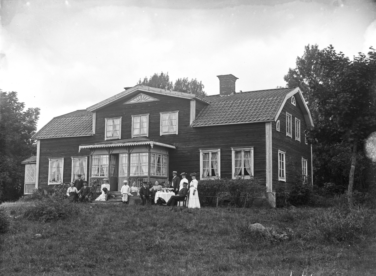Grupp framför mangårdsbyggnad, Jädra 7 (adress), Långtora socken, Uppland, troligen 9 augusti 1908