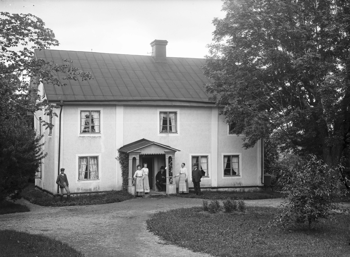 Familjen Johan August Johansson framför mangårdsbyggnaden Esplunda gård, Breds socken, Uppland, 1909