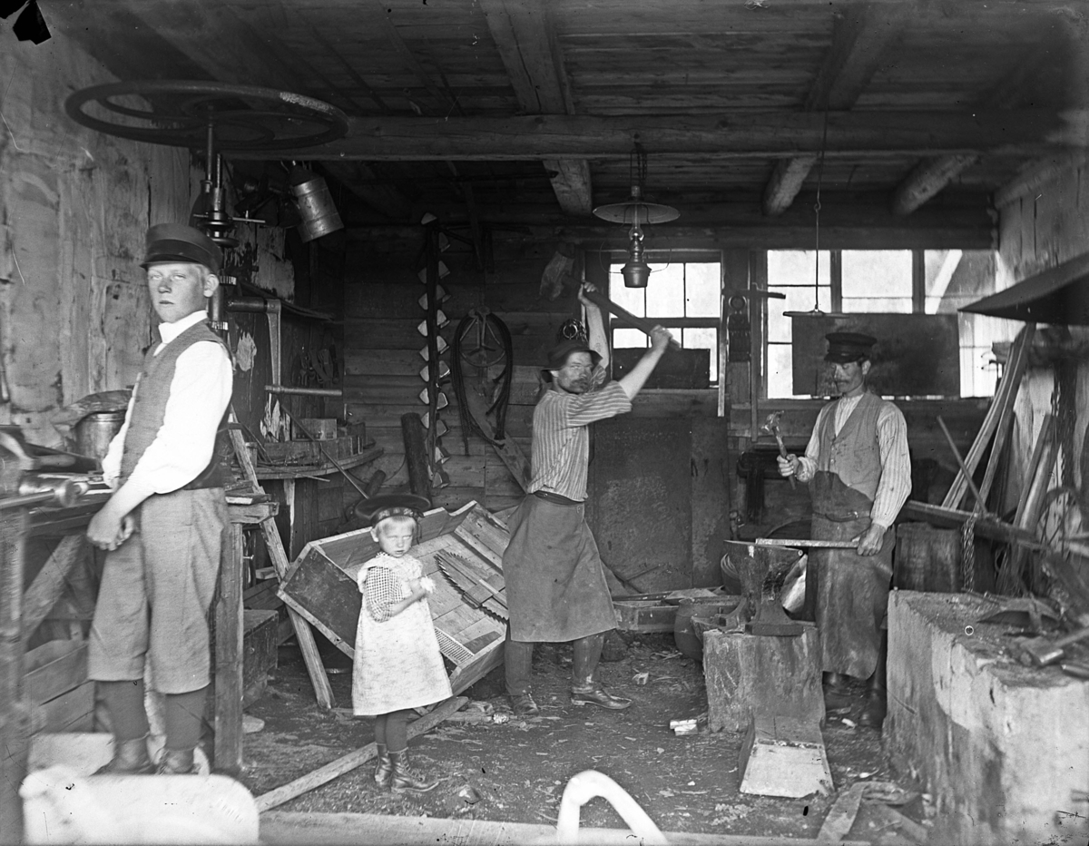 Uppland, Breds socken, Esplunda. "Lindkvists smedja, interiör". Fotot är taget den 5 juni 1910 klockan 10.