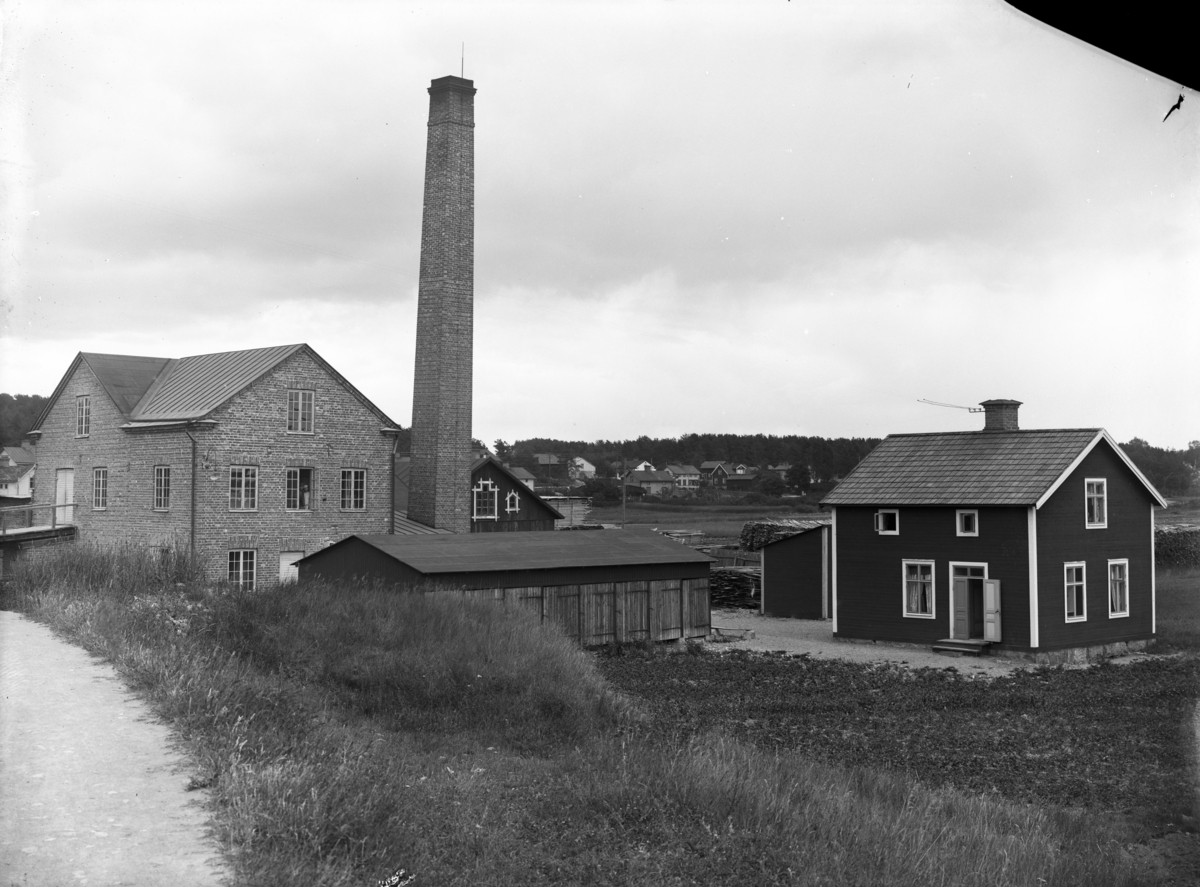 L. P. Stens ångsåg och kvarn, Stockholmsvägen, Fanna, Enköping, vy från väster. Såganläggningen etablerad 1897. Kvarnhuset t. v. uppfört 1900-1901.