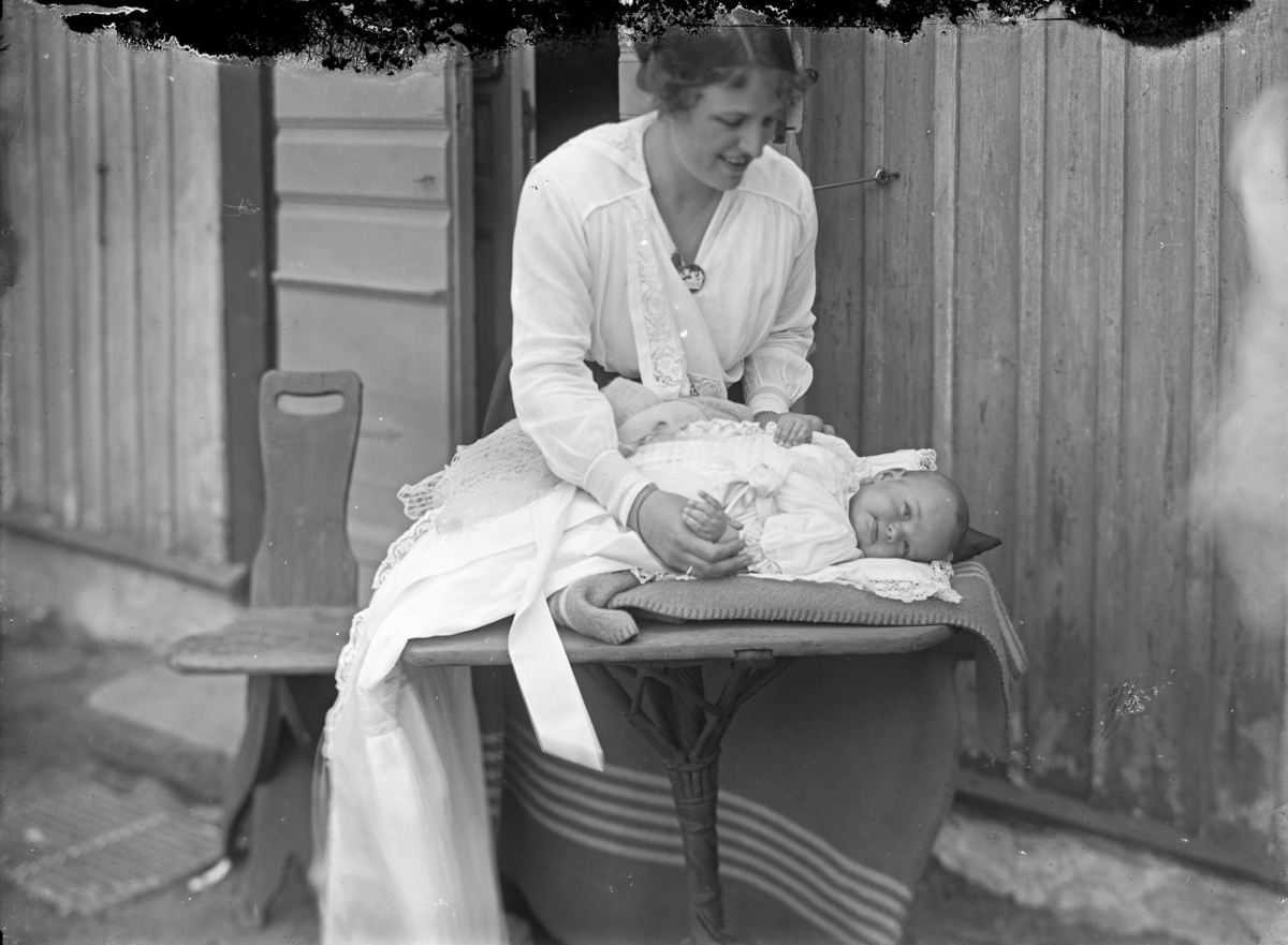 Kvinna med ett barn (i dopklädsel?), troligen 16 maj 1918