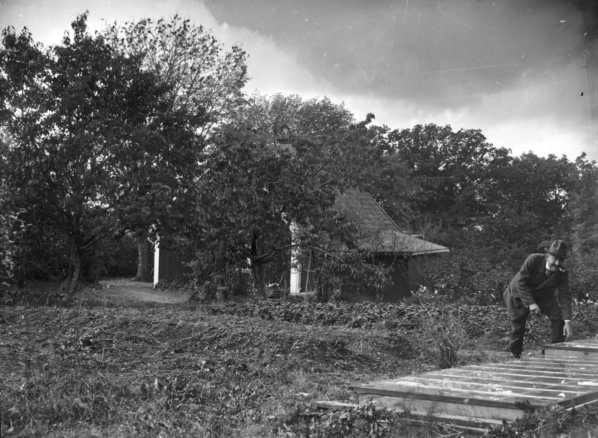 Man i trädgård, Stora Stämsvik, Övergrans socken, Uppland. Modern adress Målarvägen 10, Bålsta.