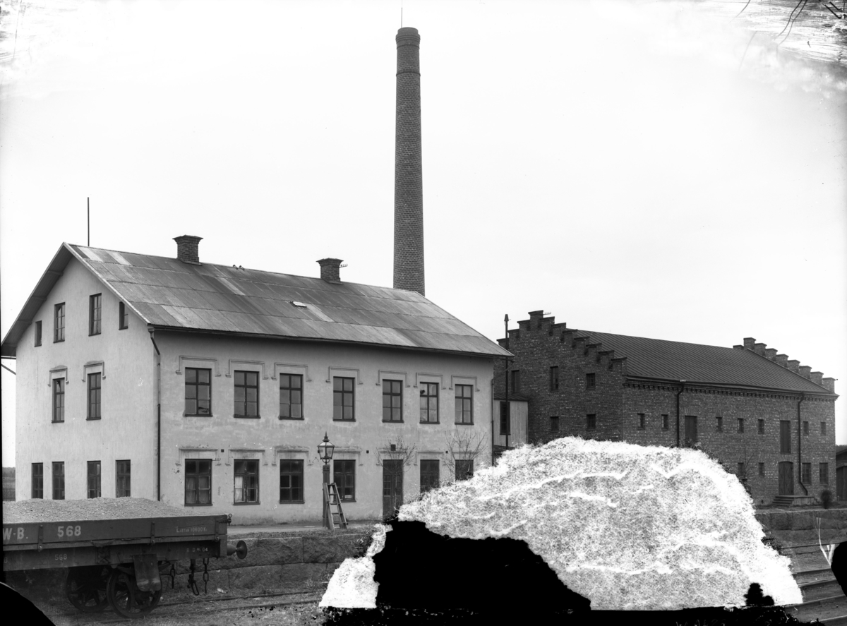 "Brödfabriken och sädesmagasinet, 1906". Banområdet vid Enköpings järnvägsstation, vy från sydväst. Troligen de byggnader som hästbrödsfabriken BendOr hade verksamhet i 1897-1906.
