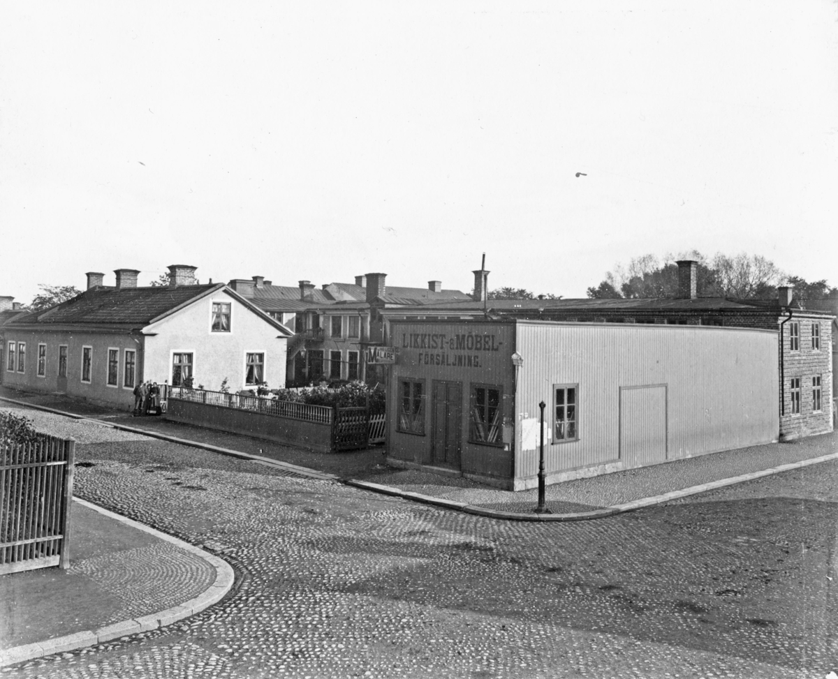 Svarvare Adolf Carlssons (1857-1935) gård och snickerifabrik, Kyrkogatan 33 - Sandgatan 31, Enköping, vy från norr, 1890-1895.