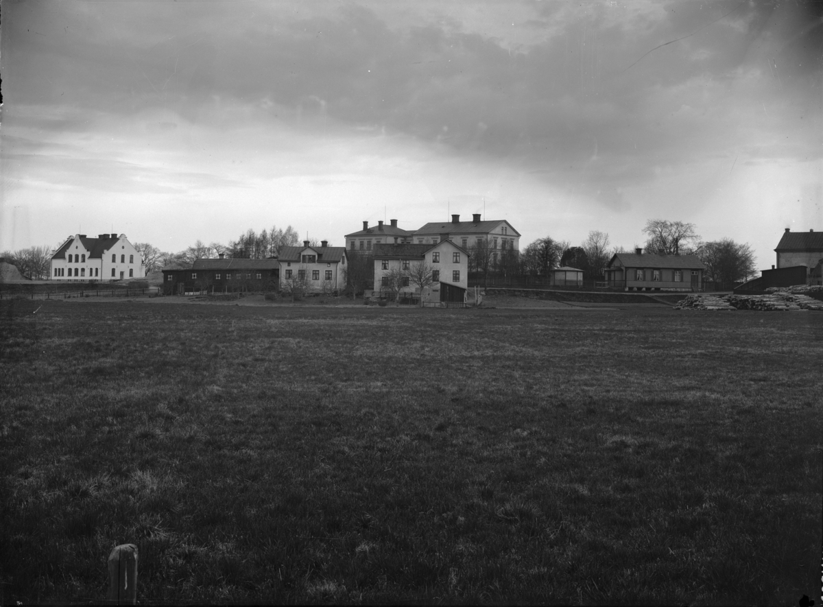 Fr. v. nya epidemisjukhuset, privatbostäder, sjukhuset, gamla epidemisjukhuset, tändsticksfabriken, Munksundet, Enköping, vy från öster, ca 1907-1911