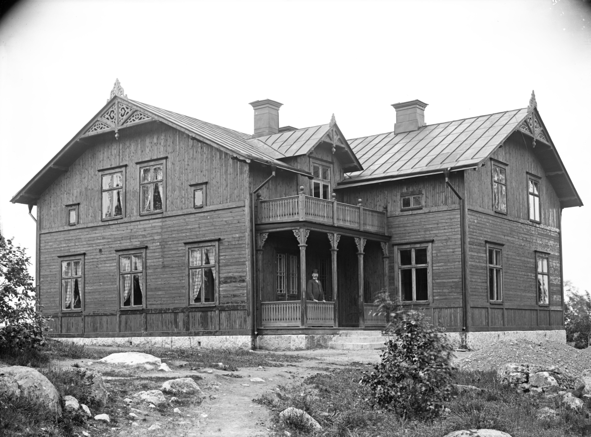 Man på veranda till stor byggnad, oidentifierad, troligen 5 juni 1906