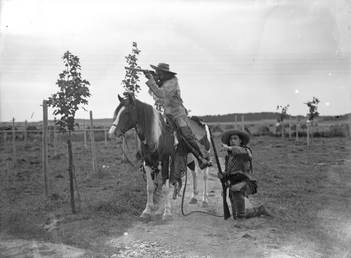 Cirkusdirektören "Brazil Jack" - Carl Rhodin (1871-1952) på hästen Pärla. Mannen bredvid okänd.