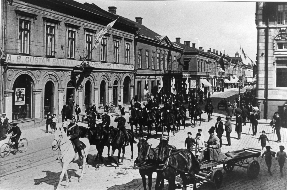 Röda Kors-parad. Ryttare på Ö. Storgatan, Jönköping.