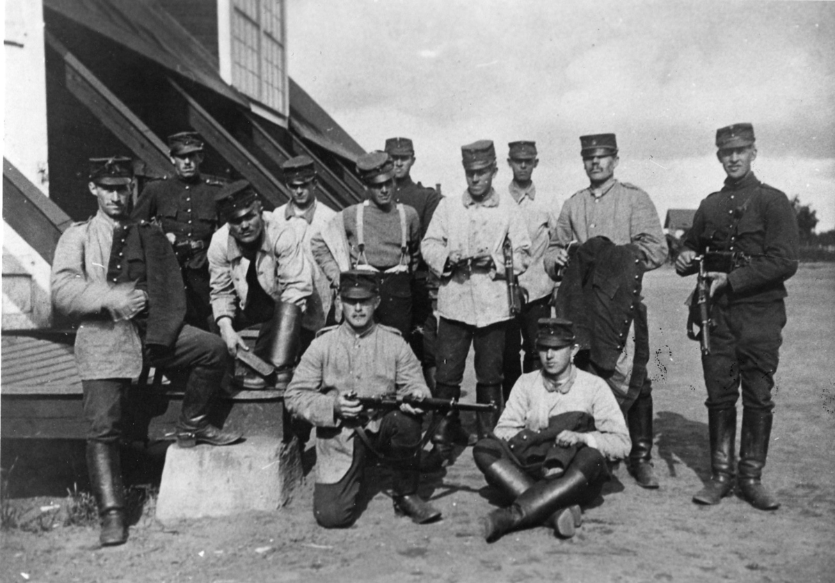 Soldater framför lägerhyddan, i Skillingaryd. Västra lägret, A 6