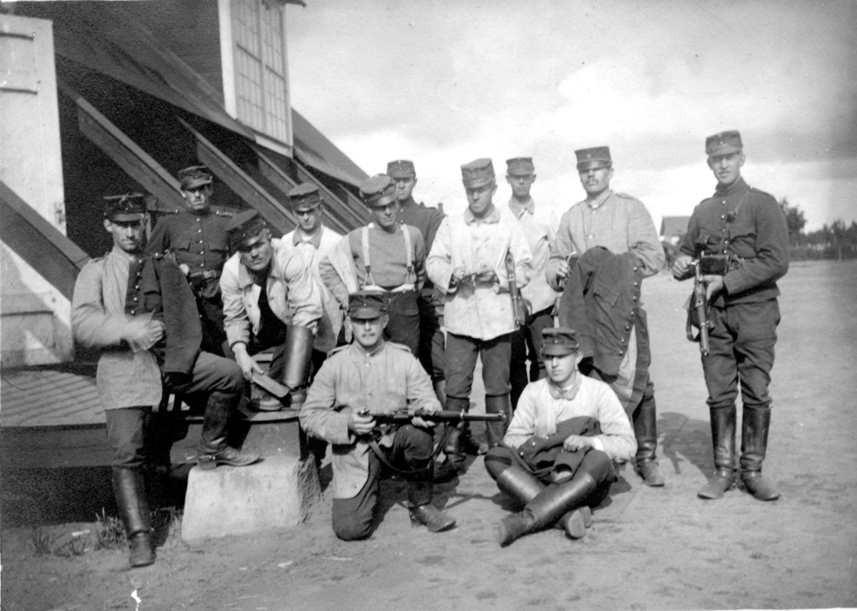 Trupp framför lägerhyddan, Skillingaryd. Västra lägret, A 6.