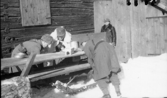 Utspisning, löjtnant Jung i päls.