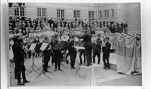 Musikkåren, A 6, framför läroverket i Jönköping, examen.
