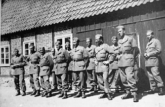 Soldater framför ladugård. I. eller II. kårdivisionen, A 6.
