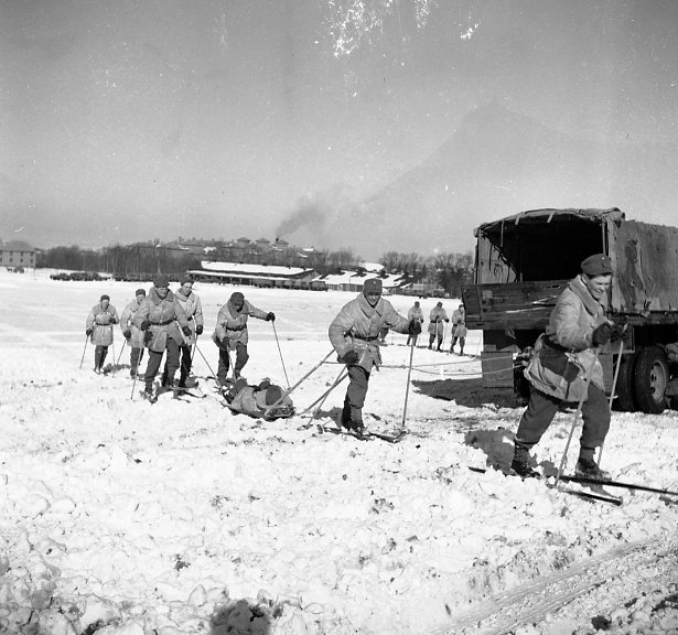 Skidpatrull på övningsfältet, kasern i bakgrunden.