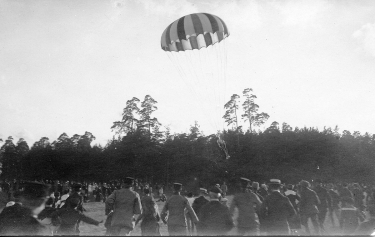 Titel: Major Orde Leeds hopp med fallskärm i Jönköping Midsommardagen 1920.