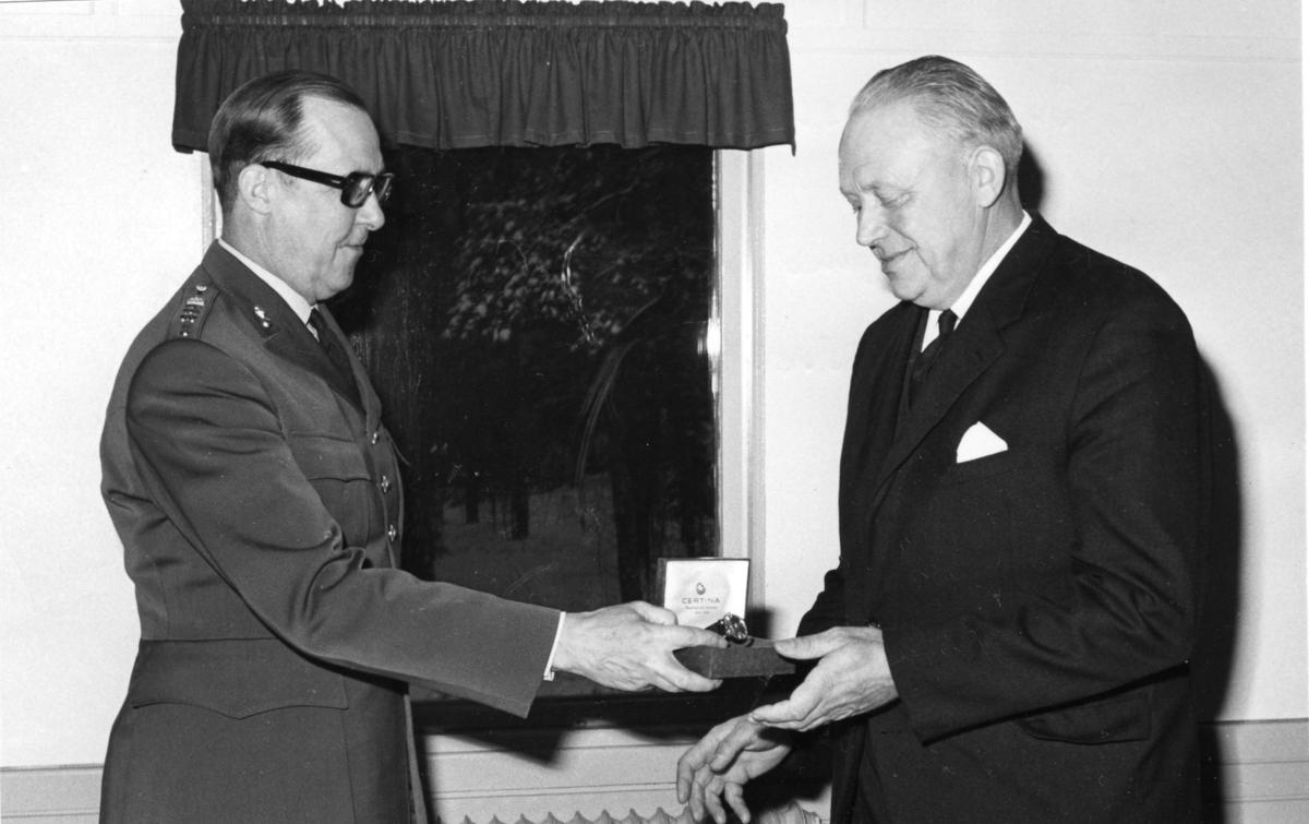 Titel: Avtackning av förrådsarbetare B. Svensson. Överste Tegmo utdelar NOR.