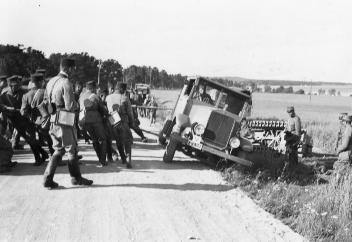 Bärgning av lastbil, A 6. Skolbatteriets marsch till Karlsborg.