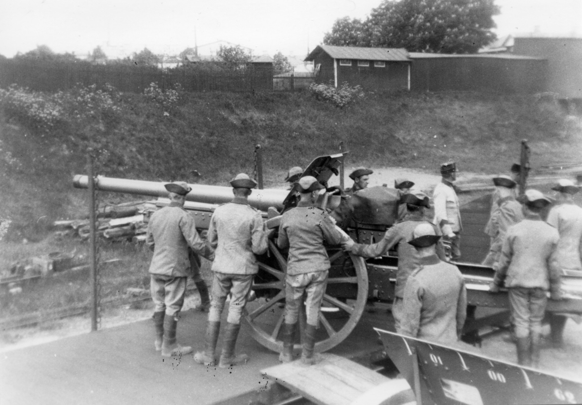 Kanon m/1917. 10,5 cm. Lastning av pjäser på järnvägsvagn.