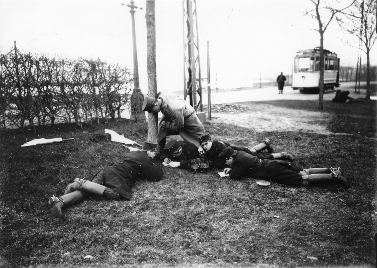 Signalmaterielutbildning. Nedanför kasern, A 6. Spårvagn i bakgrunden.