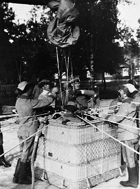 Ballongkorg på marken. I mitten löjtnant Stuart.