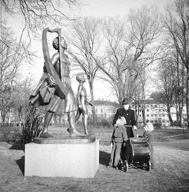 Kvinna med två barn vid Harpospelaren i Rådhusparken.