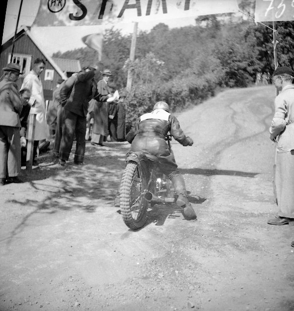 Motorcykeltävling. Starten. Backtävling i Klevaliden, Huskvarna?