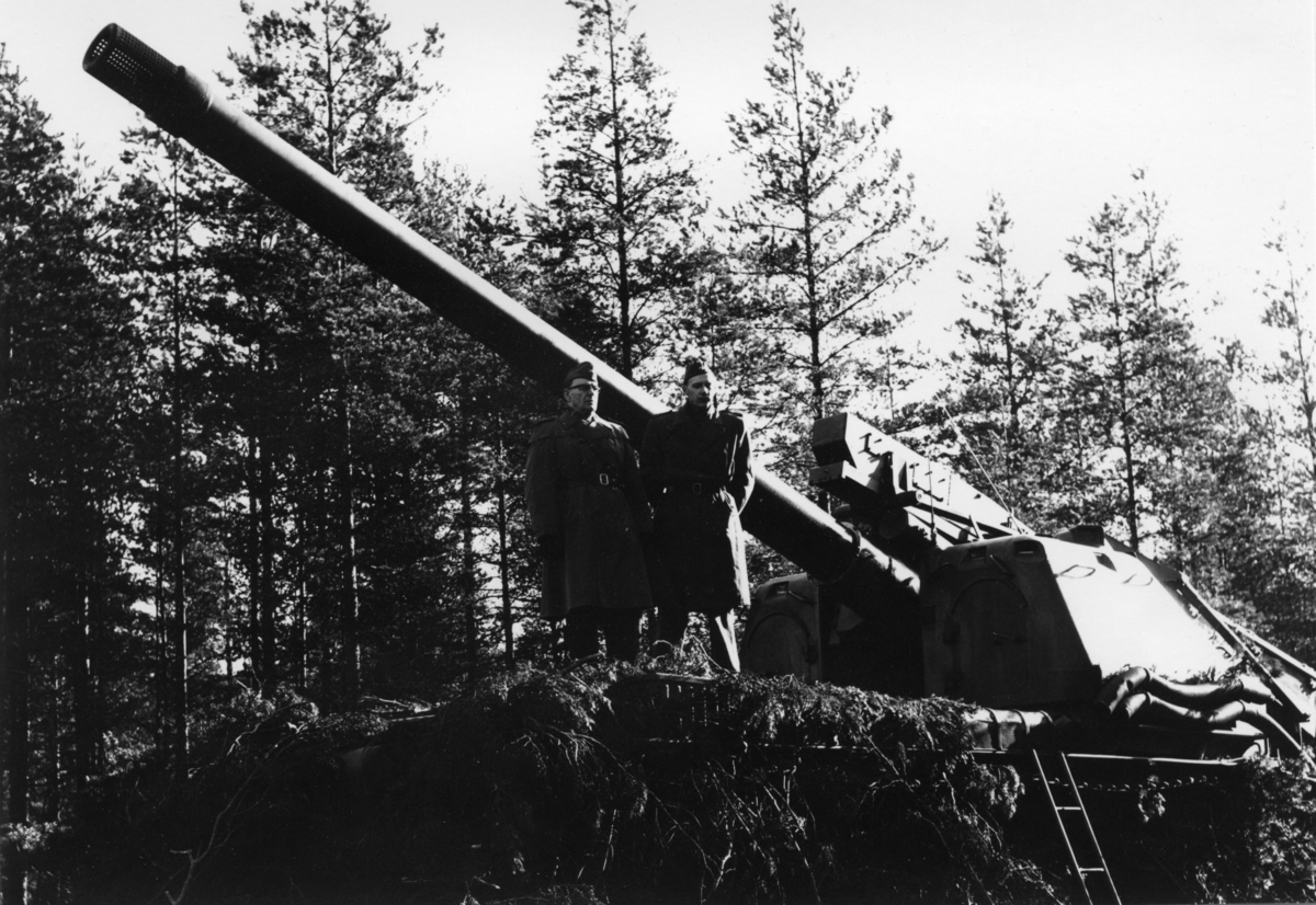 Bandkanon, 15,5 cm. Skillingaryd. Till vänster: tygverkmästare Ståhl. Till höger armétekniker Johan Seger, överfurir på Tygavdelningen, A6. Förevisning för utländska militärattachéer.