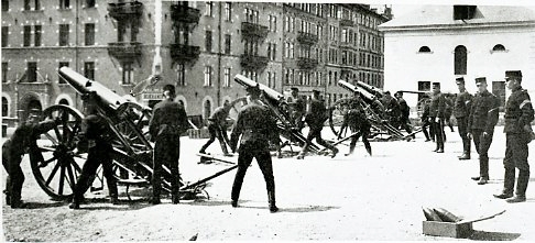 Haubits m/1891. 12 cm. Batteri, pjäsexercis.