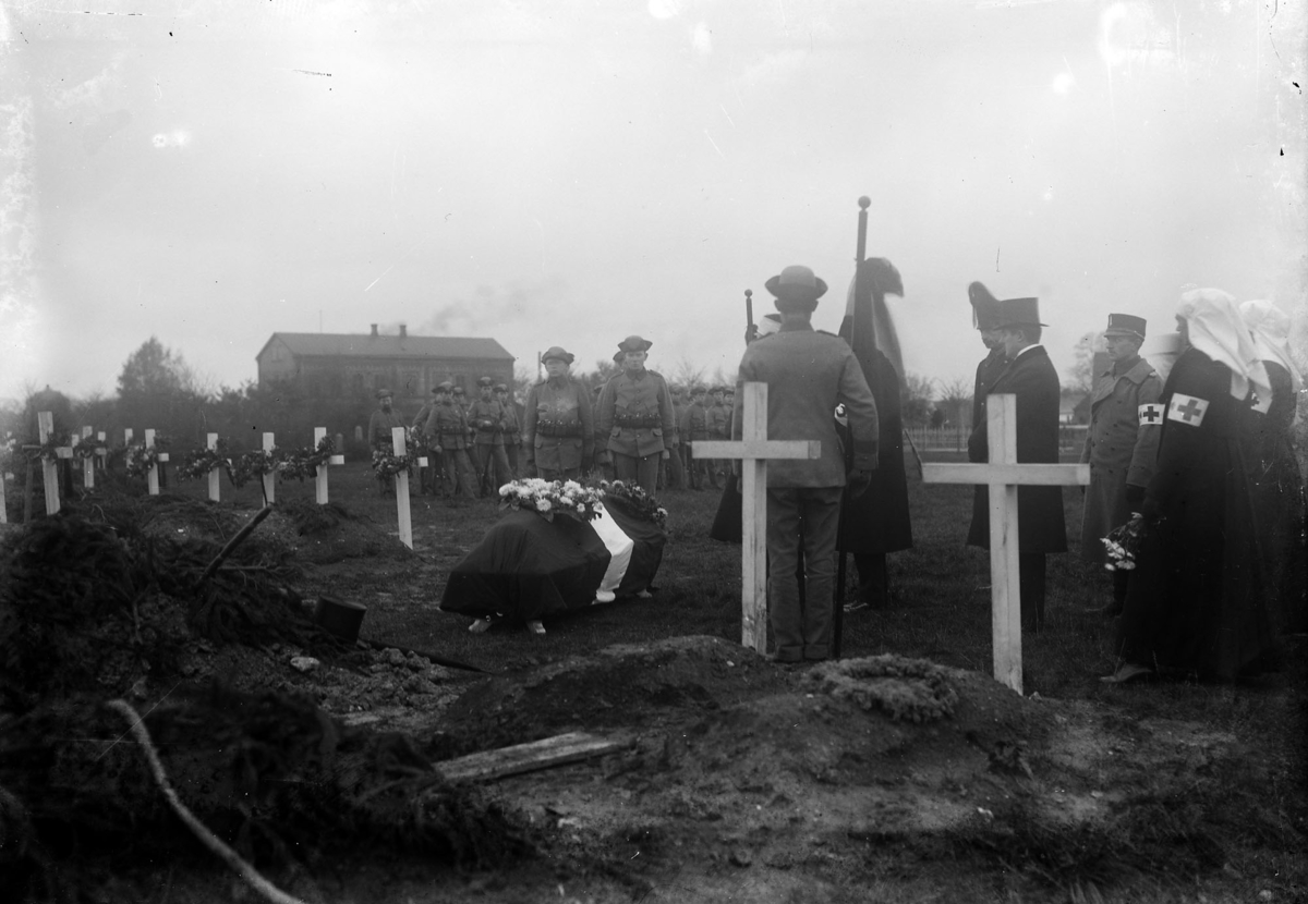 Invalidutväxlingen 1915-1917. Begravningen år 1918 på Invalidkyrkogården, Norra kyrkogården i Trelleborg. En mängd soldater och Röda korssystrar är närvarande. I bakgrunden syns Norra skolan.