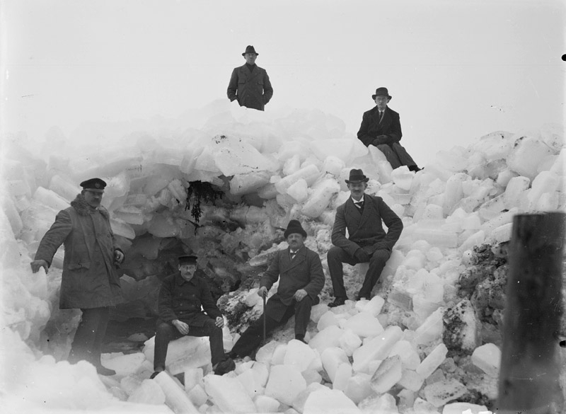 Isvinter. En grupp män står och sitter på en imponerande hög med isflak.
