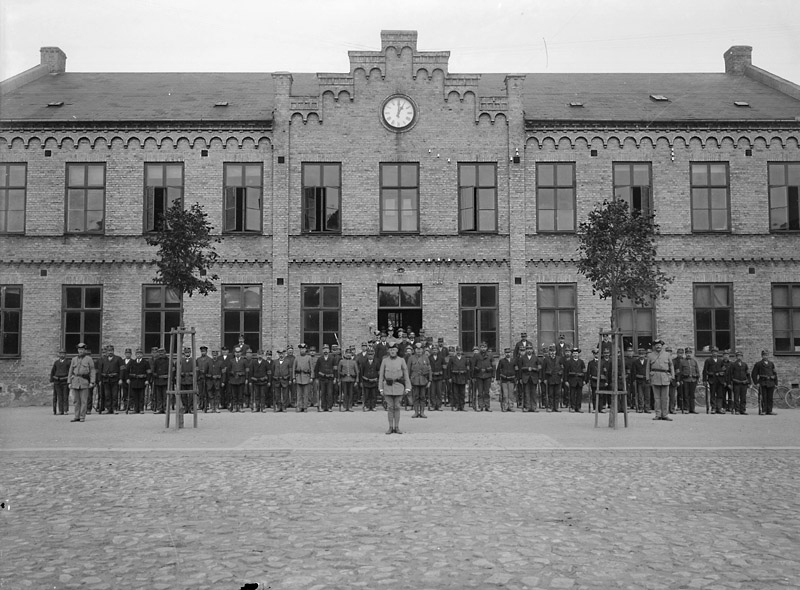 Första världskriget. Landstormen står uppställda framför Centralskolan.