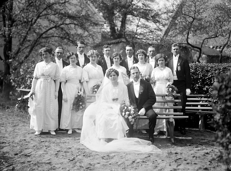 Brudpar med 6 par tärnor och marskalkar utomhus.