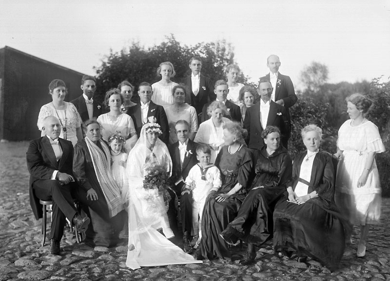 Bröllopssällskap utomhus. Ingenjör Pehrsson Gummifabriken. Ester F Norman.