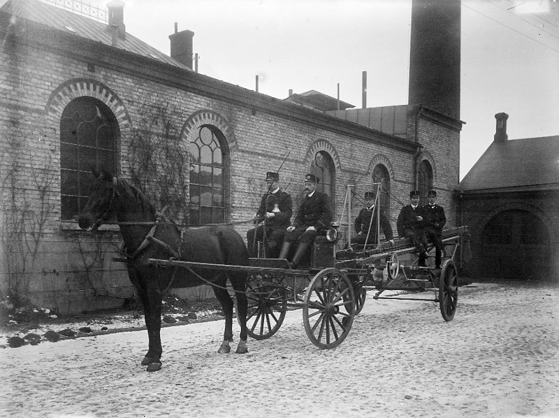 Brandkåren. Brandkåren rycker ut i början av 1900-talet. På kuskbocken sitter brandmästaren J. Svensson och polis J. Fält. På stegvagnen syns brandmännen/poliserna Per Dahl, F.W. Nilsson och E. Olovsson.