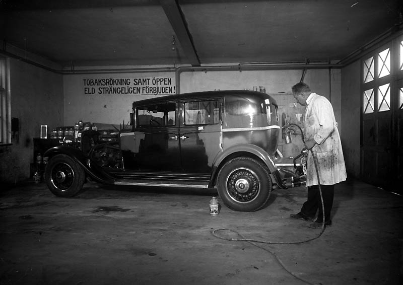 Bilsprutning Malmö. Interiör verkstad eller industri. En man sprutmålar en bil.