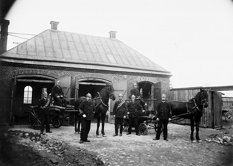 Trelleborgs brandkår. Från 1896 fanns i Trelleborg en kombinerad polis och brandkår vid Nygatan i kvarteret Igelkotten. I bildens mitt står major Malmros. Till vänster om honom polis Ferm och längst till höger polis Björk.