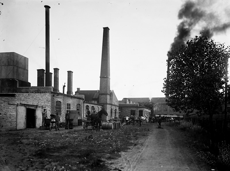 Müller och Mann. Exteriör, Industri . Män och hästdragna vagnar med tunnor.