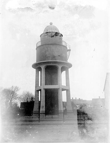 SJ vattentorn av cement . Östra stranden. I förgrunden Rydsgårds järnväg. Till vänster i fonden ser man träd i lasarettets park. Till höger gavlen till ett hus, kallat Kalkugnen som låg söder om Snäckgränden.