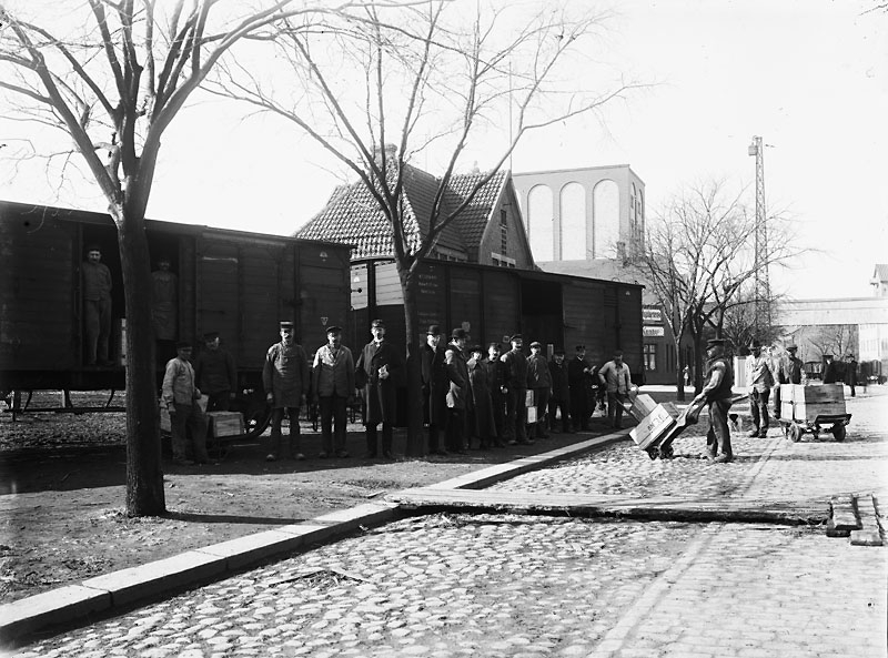 Röda korset Hamngatan sedd västerut. Ett tåg som lastas. Lastningen sker från Ganslandt & Gussing Kolonivarubolag, idag år 2004 kallat Telinska magasinet. Bortom tåget ligger Stenkolsbolaget och Importbolaget. Ångkvarnen i bakgrunden.
