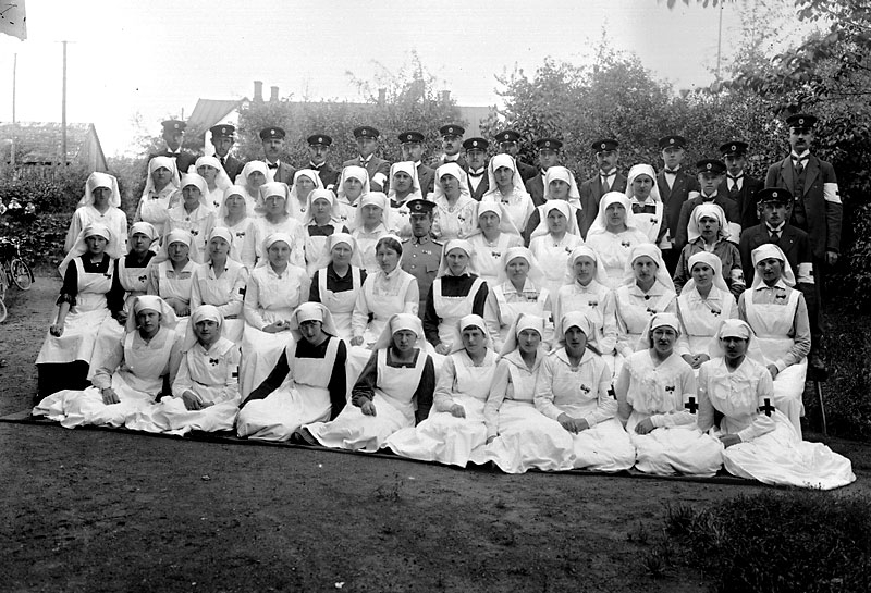 Röda korset. Gruppbild ute. En mängd kvinnor och män i rödakorsuniformer.