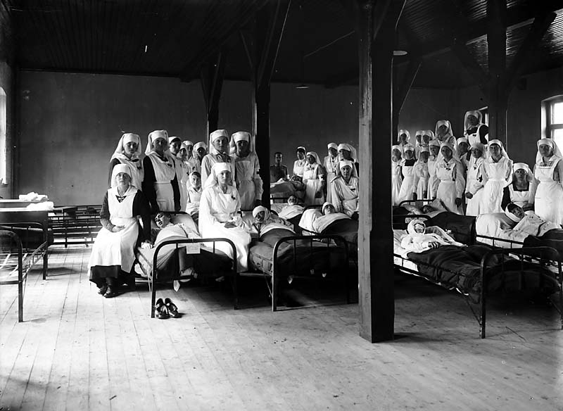 Röda korset. En mängd rödakorssystrar i ett stort rum med pelare. Patienter i sängar. Sjukvårdsövning?