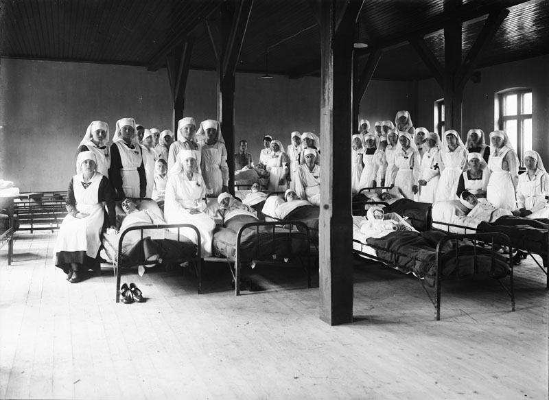 En mängd rödakorssystrar i ett stort rum med pelare. Patienter i sängar. Sjukvårdsövning?