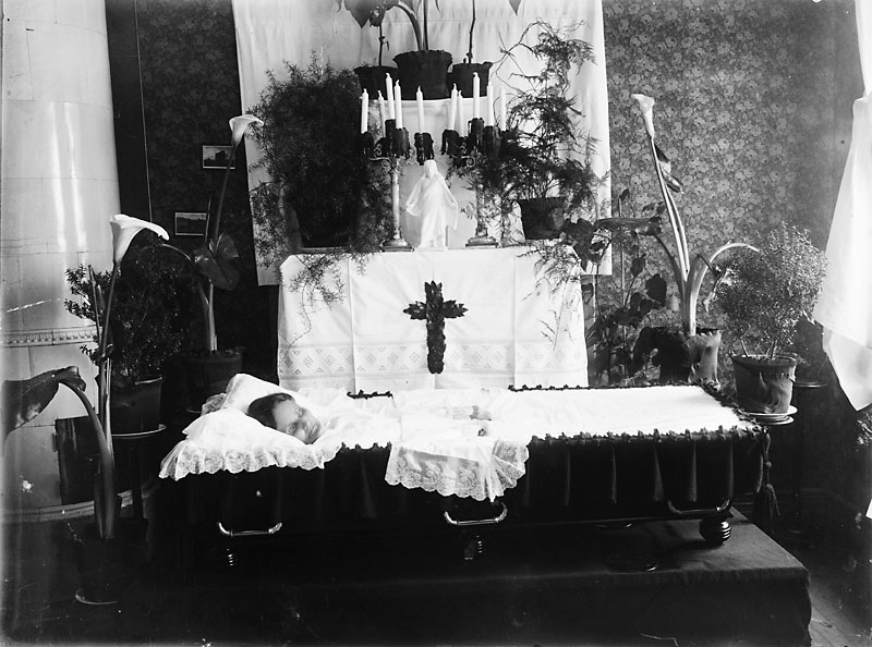 Död kvinna i kista. Altare i bakgrunden. Blommor runtomkring.