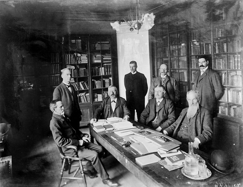 Gruppbild. Bolagsstämma. 8 okända män står och sitter runt ett bord. Väggarna är täckta med bokhyllor. I hörnet står en kakelugn.