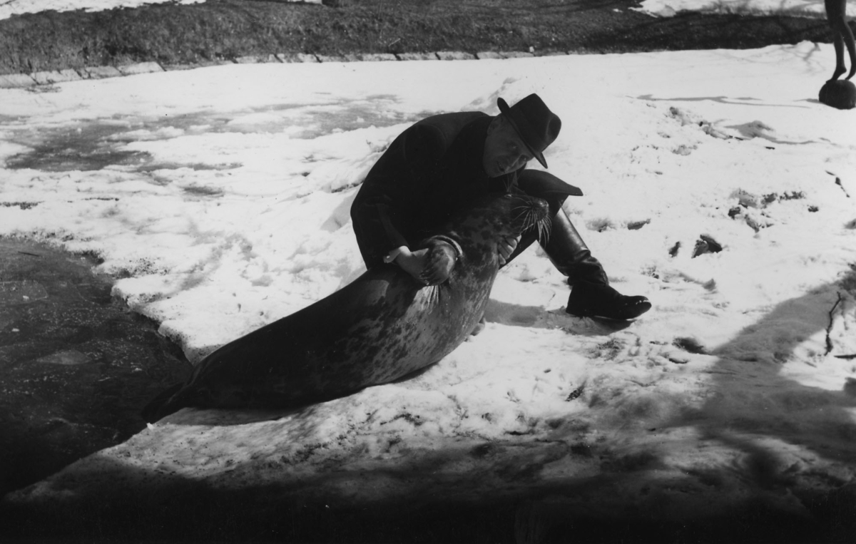Titel: Fredrik W Nilsson och sälen Isak i Stadsparken.