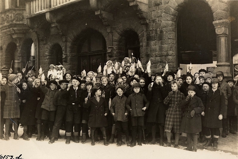 Mjölkpropaganda, en provisoriskt anordnad mjölkbar i Kontinentgatan 1932, flera personer håller mjölkflaskor, 6153d, negativ Johnsson 9800.