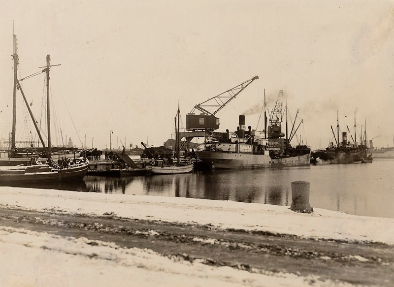 Fartyg, Larus, Sockerbolaget, 1930 i Nyhamnen, Solfjädervägen redan bortsprängd, övr. nr. 7288, (PÄM 1995 överstruket).