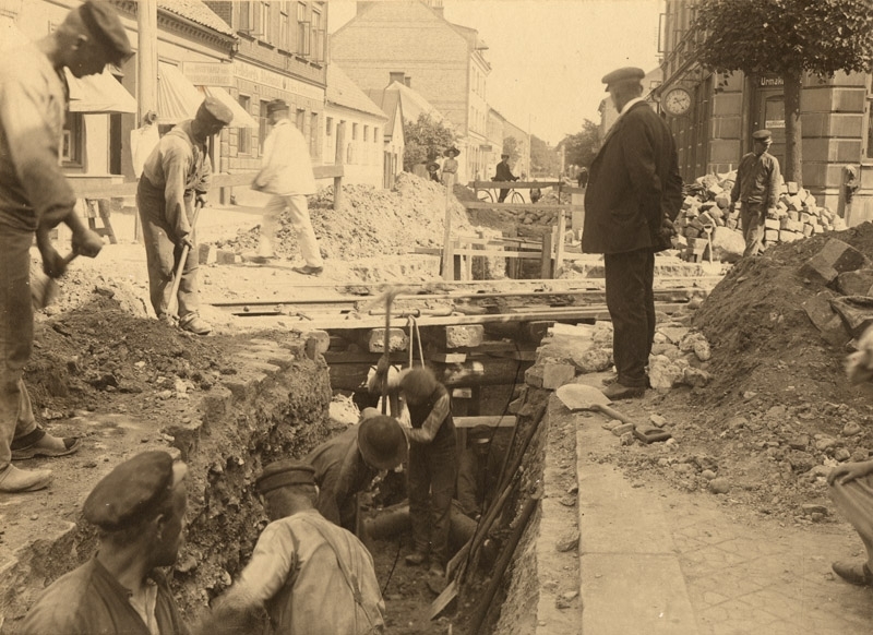 Gatuarbete,rörnedläggning,vy mot ost, till höger i fonden Wirgins urmakeri, till vänster Trelleborgs Allehanda, korsningen östergatan-hantverkargatan.