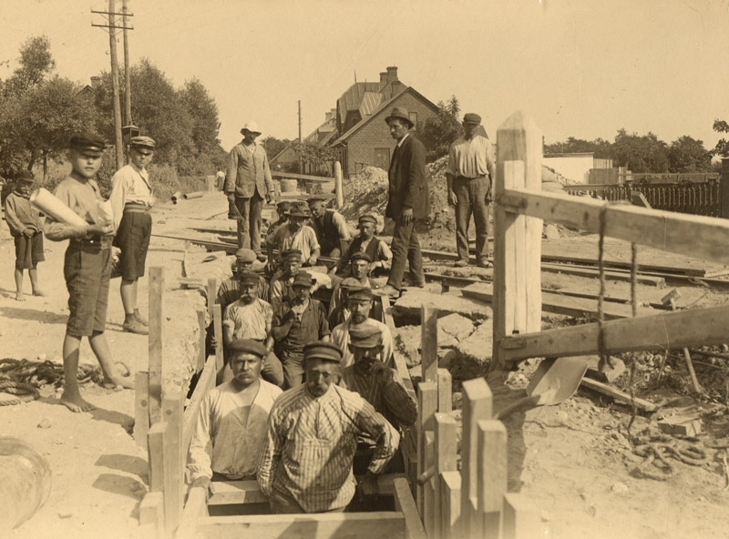 Gatuarbete, gruppbild, järnvägsräls småpojkar tittar på.