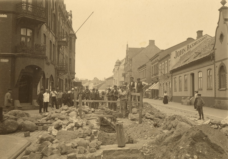 Algatan-Kontinentgatan mot väster, gatuarbete , till vänster. Krenziskys hus? Bankahörnan, gruppbild,till höger Smiths handelsgård, John Rasmussons jernhandel.